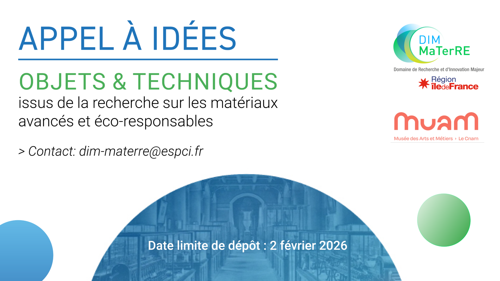 Les idées et contributions devront impérativement s’inscrire dans les axes thématiques du DIM MaTerRE ainsi que dans les domaines de collection du Musée des Arts et Métiers concernés (Matériaux, Energie, Transports, Construction).