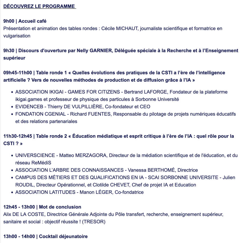 Hosted by journalist Cécile MICHAUT, this event aims to bring together CSTI stakeholders, scientists and industrialists from the Paris region, and to highlight innovative methods of scientific mediation. Round tables will open the discussion on the dissemination of science to the general public, the dynamics of mediation and their evolution.