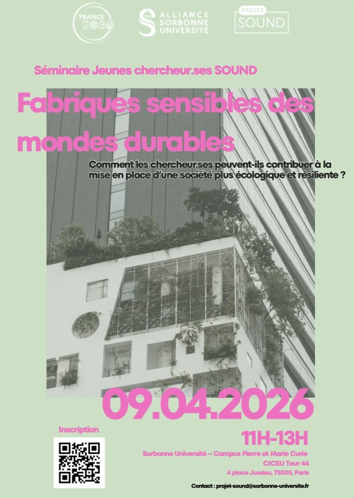 Comment les chercheur·ses peuvent-ils contribuer à la mise en place d’une société plus écologique et résiliente ? Ouvert à tous les membres de l’Alliance Sorbonne Université, organisé et présenté par les jeunes chercheuses et chercheurs du programme SOUND (doctorantes et doctorants, post-doctorantes et post-doctorants), ce séminaire bi-trimestriel s’inscrit dans la dynamique du projet SOUND.